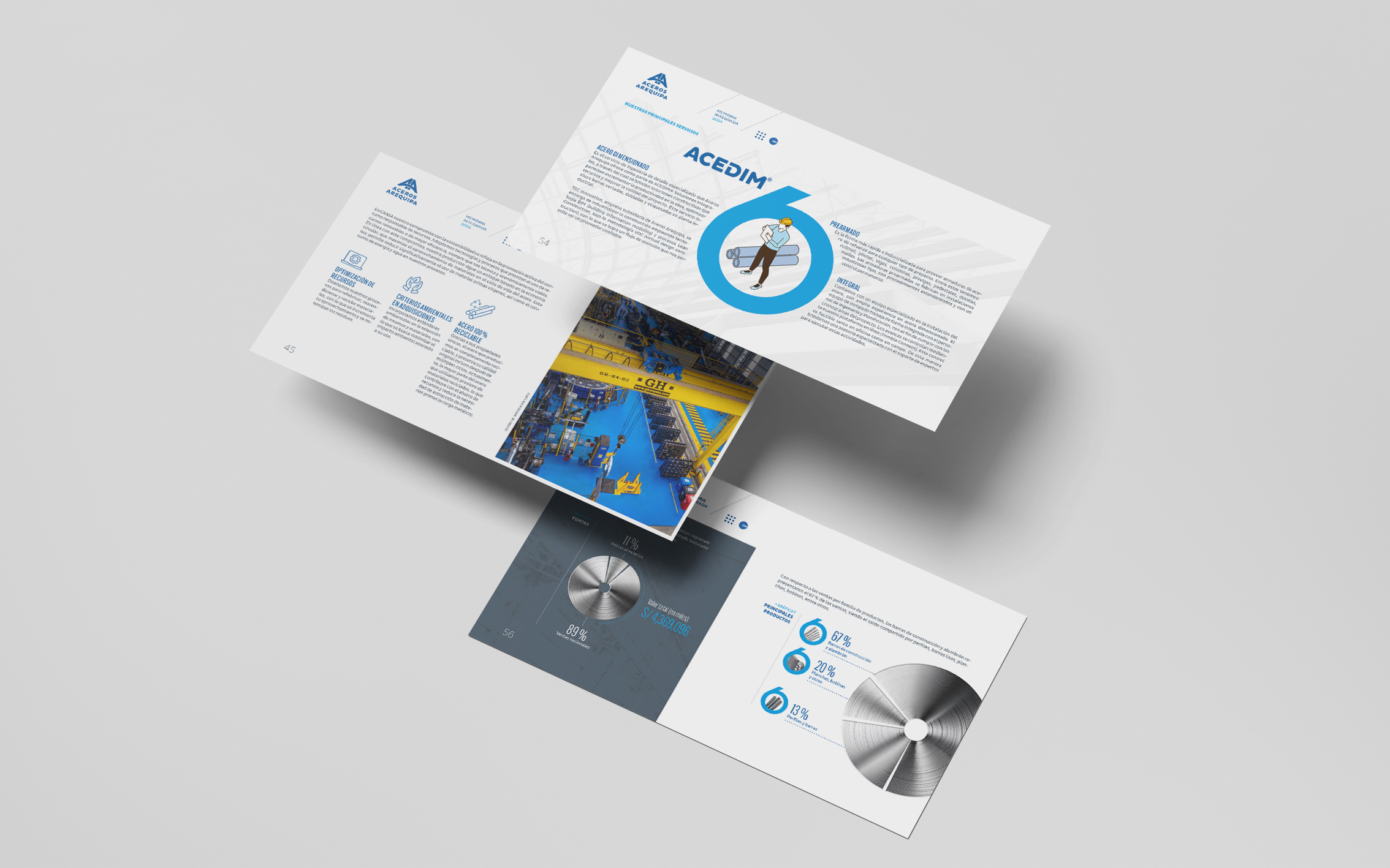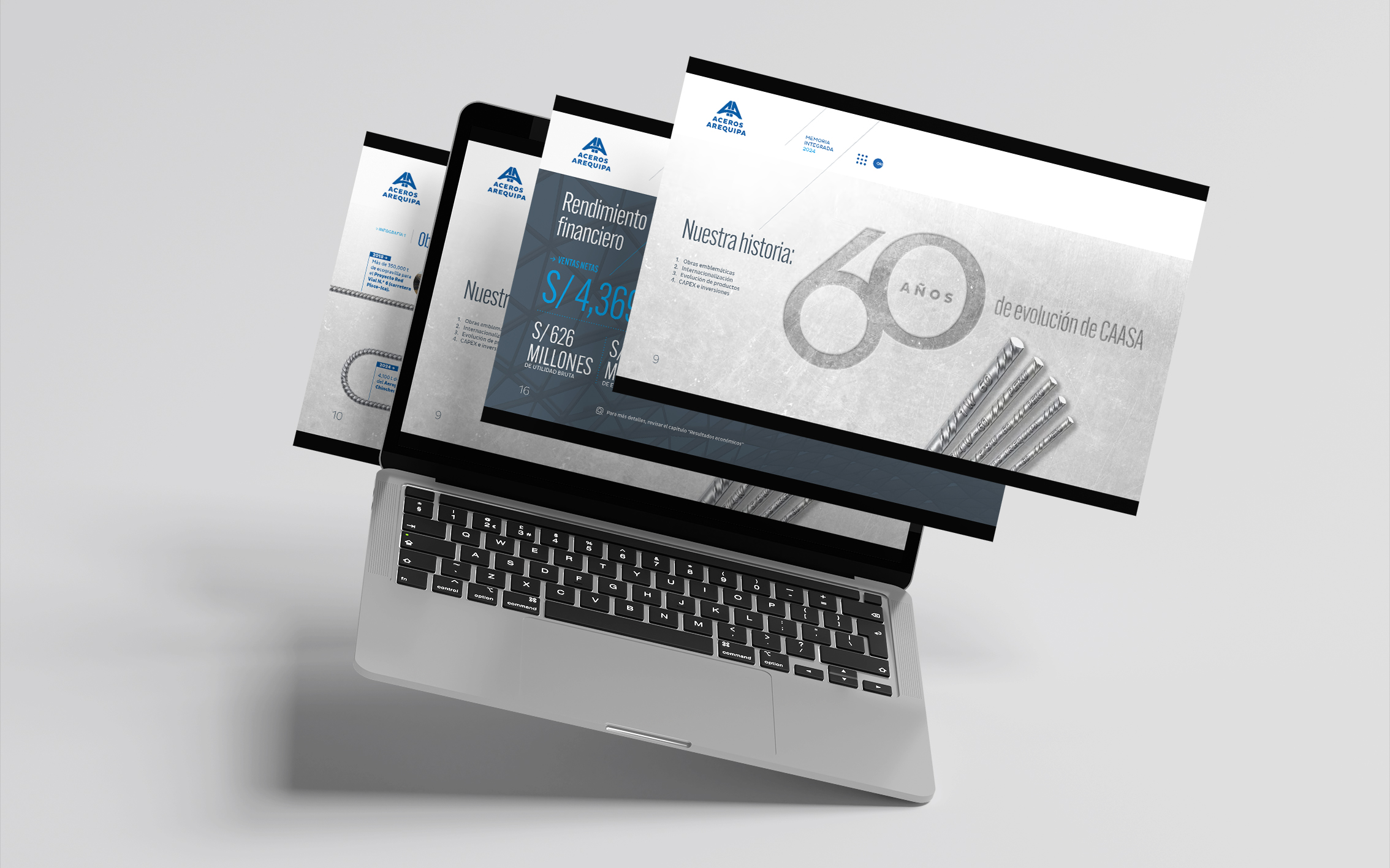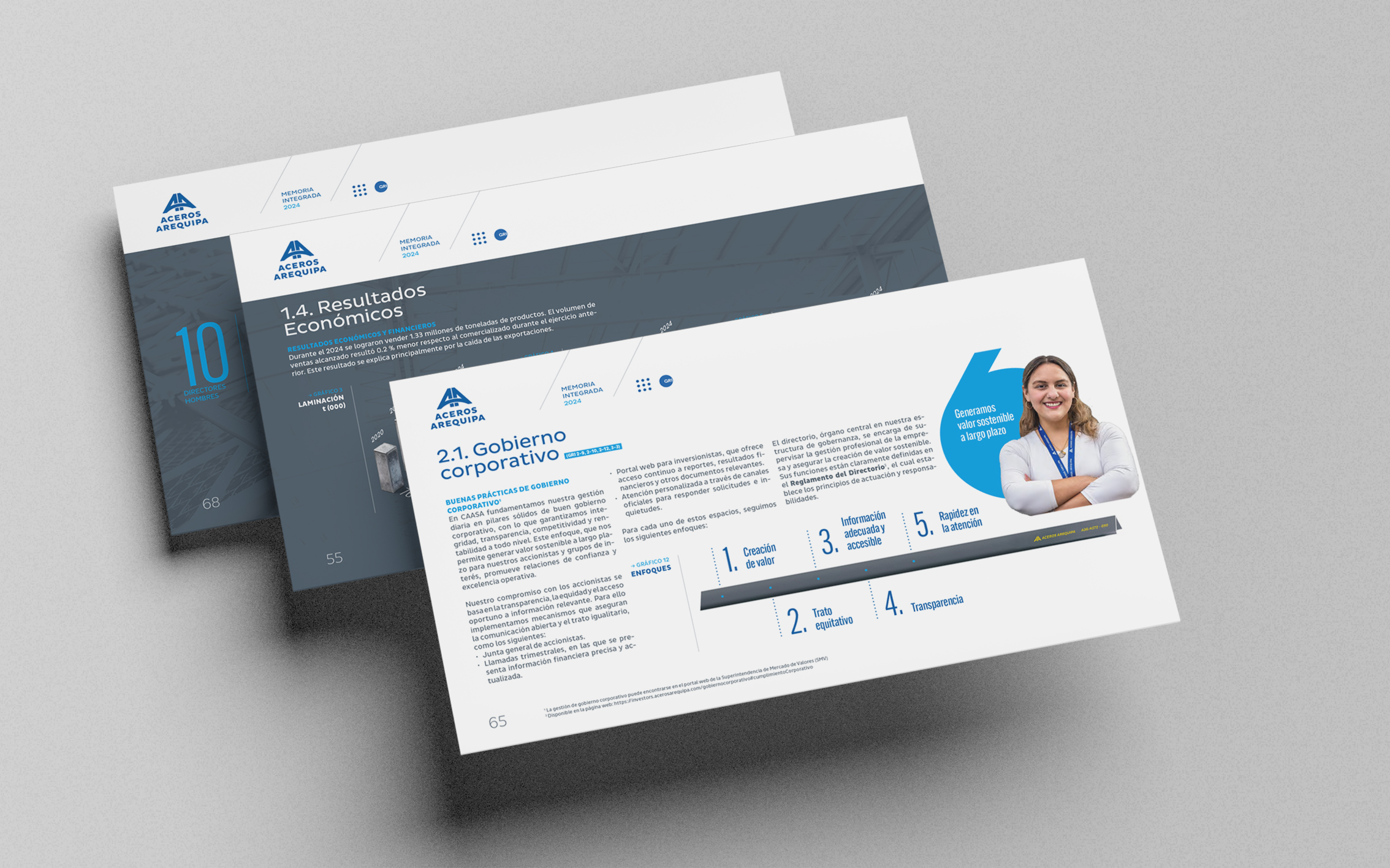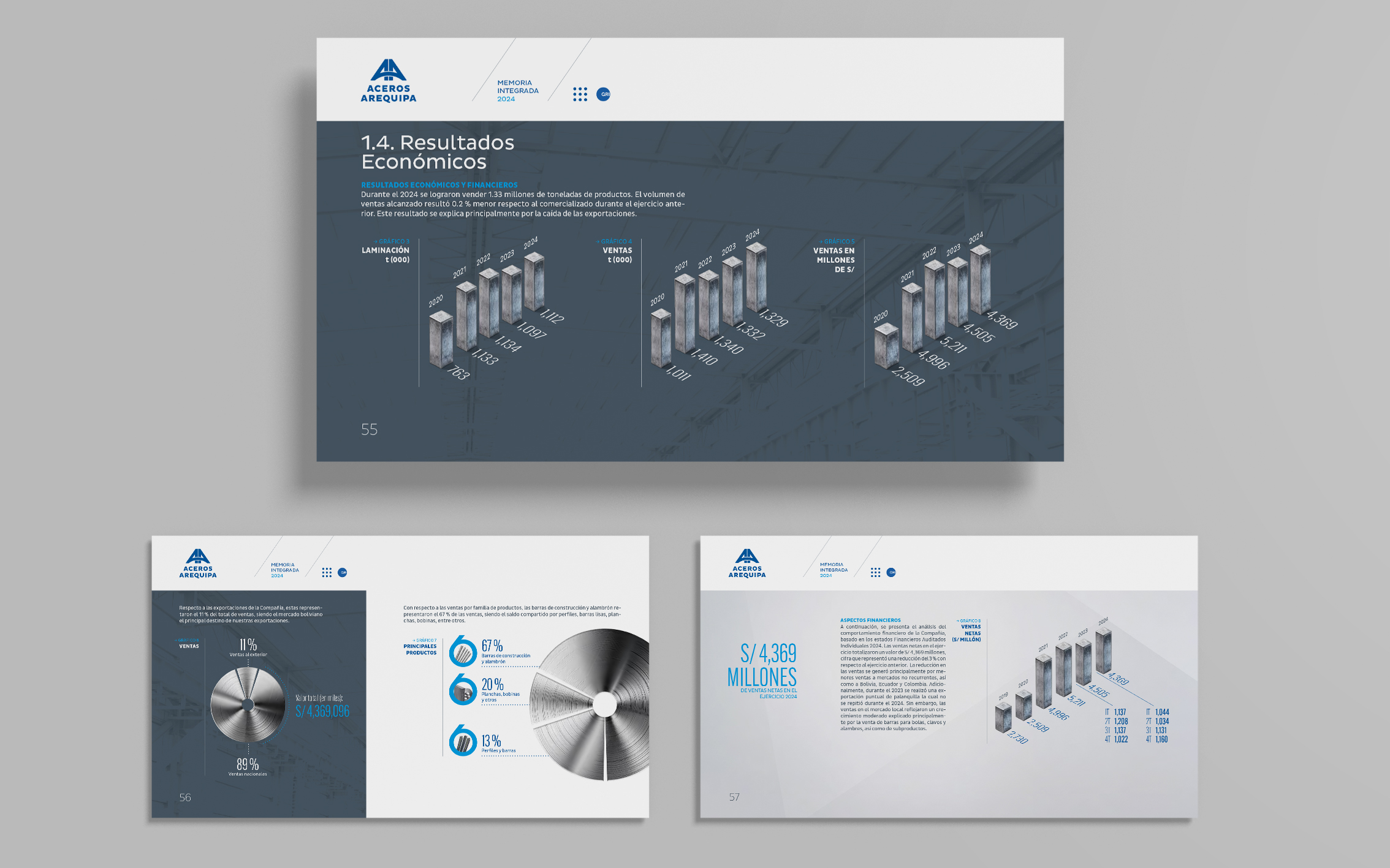 La memoria integrada 2024 de Aceros Arequipa celebró sus 60 años construyendo los cimientos del país —de carreteras y hospitales a hogares. Desde hace tres años confiaron en nosotros el diseño de sus reportes e informes internos. Para esta edición especial, trabajamos con su identidad corporativa priorizando legibilidad, orden y claridad como bases de comunicación.