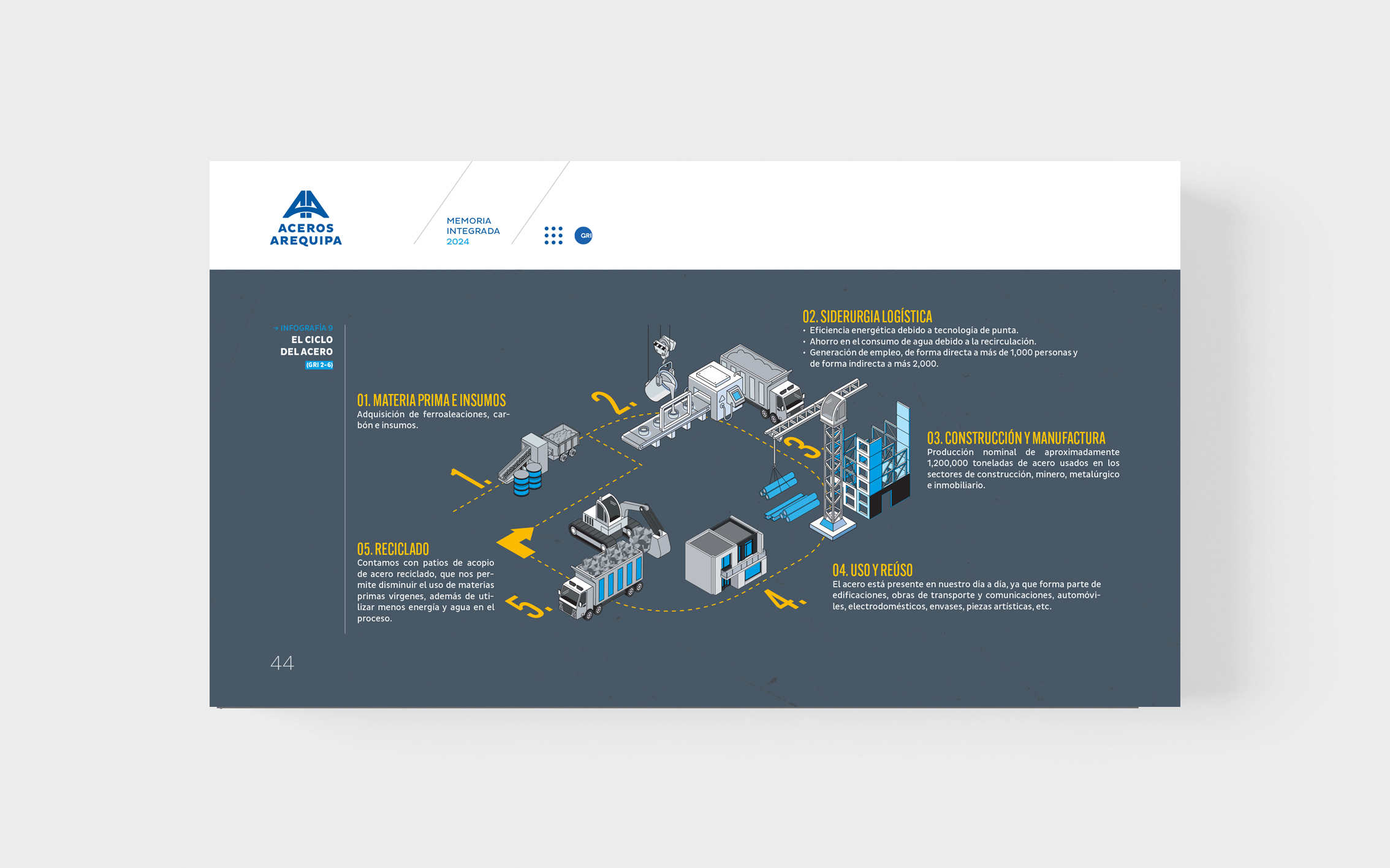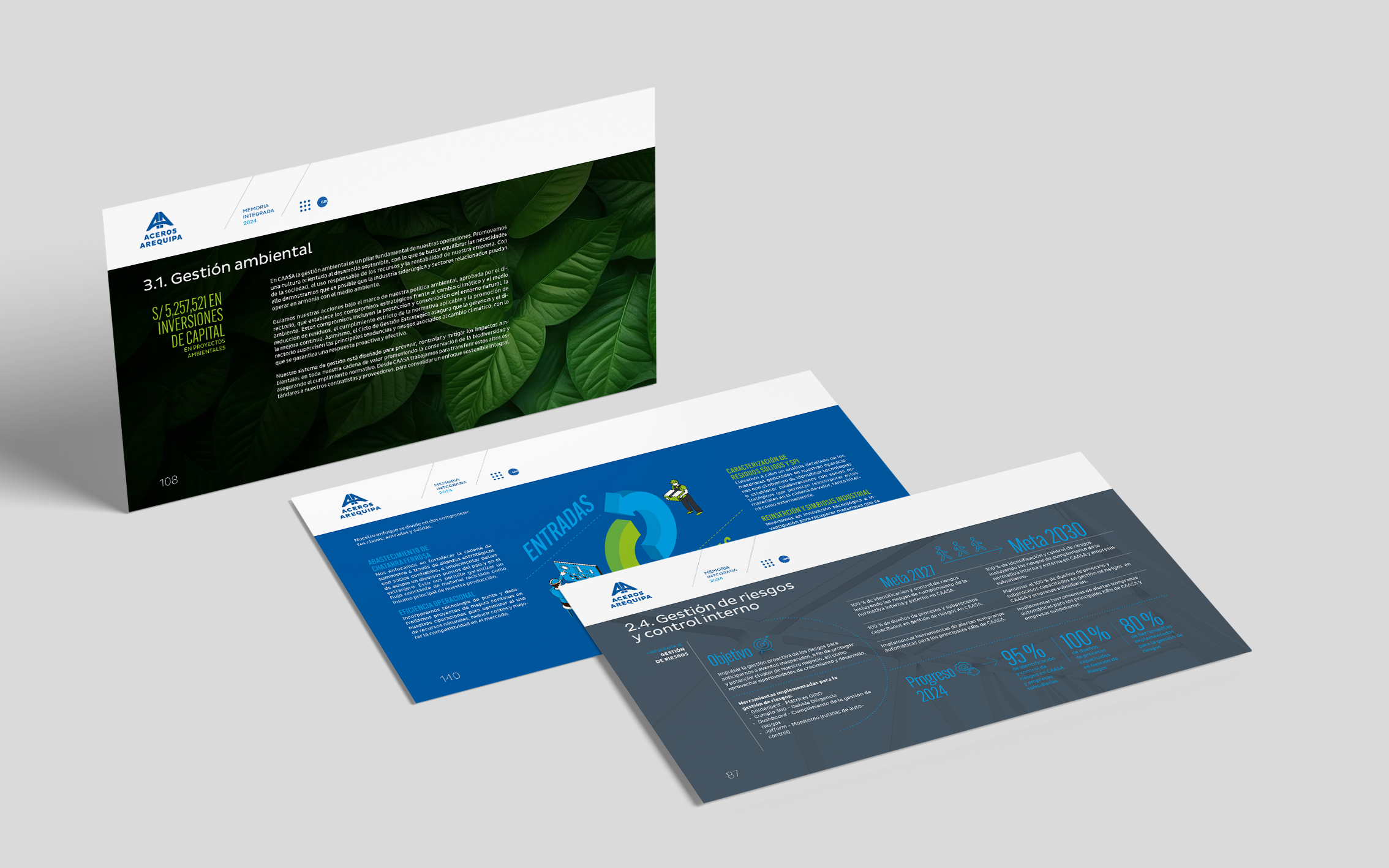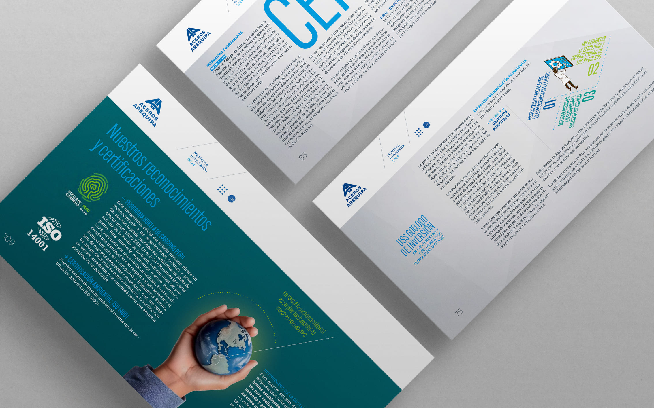 La memoria integrada 2024 de Aceros Arequipa celebró sus 60 años construyendo los cimientos del país —de carreteras y hospitales a hogares. Desde hace tres años confiaron en nosotros el diseño de sus reportes e informes internos. Para esta edición especial, trabajamos con su identidad corporativa priorizando legibilidad, orden y claridad como bases de comunicación.
