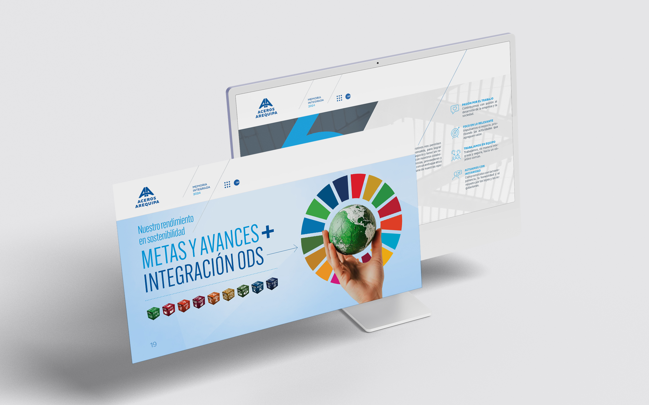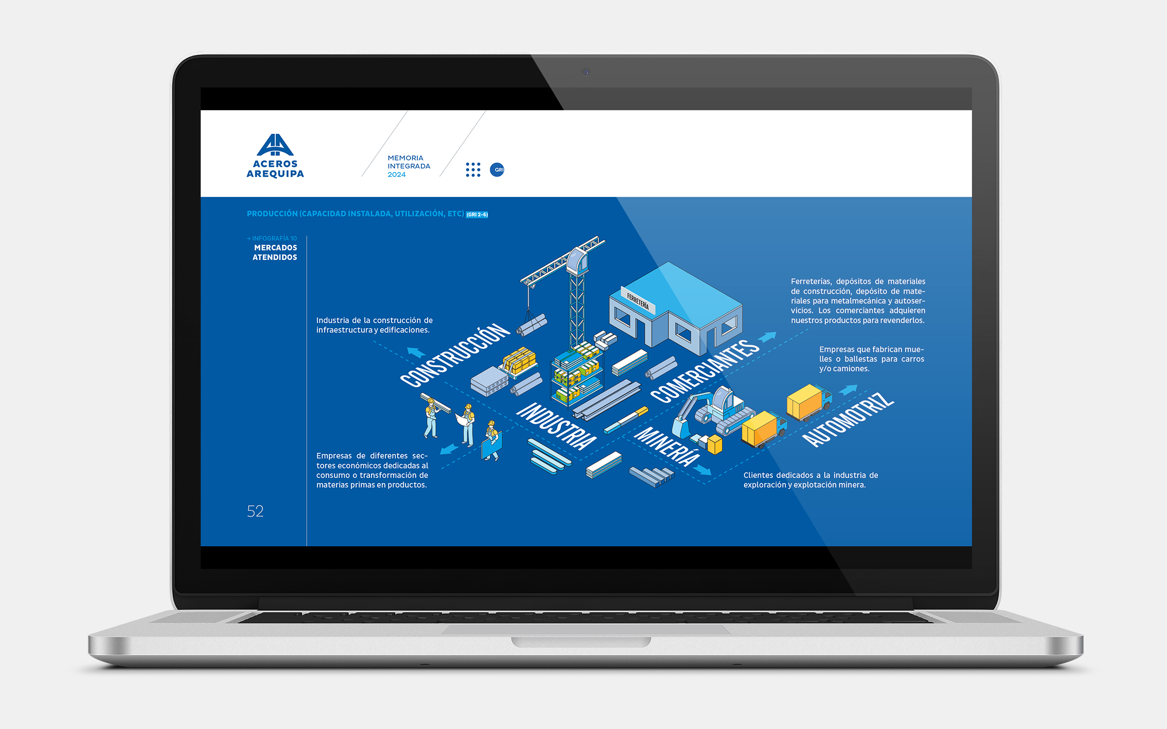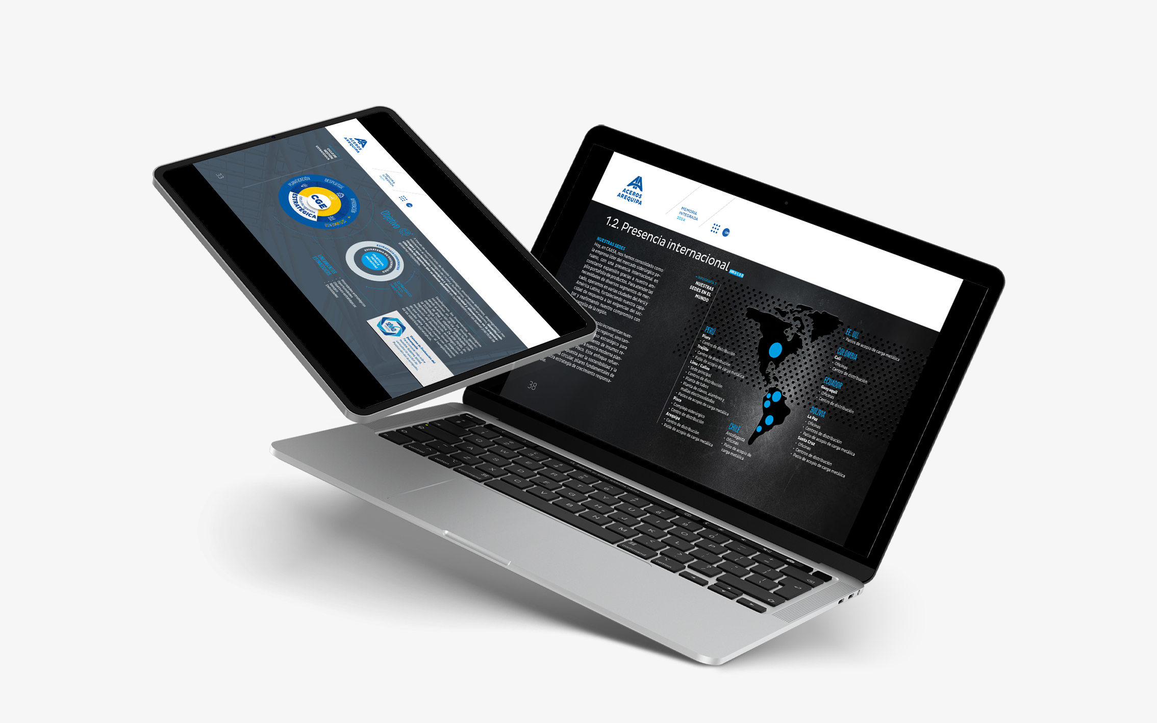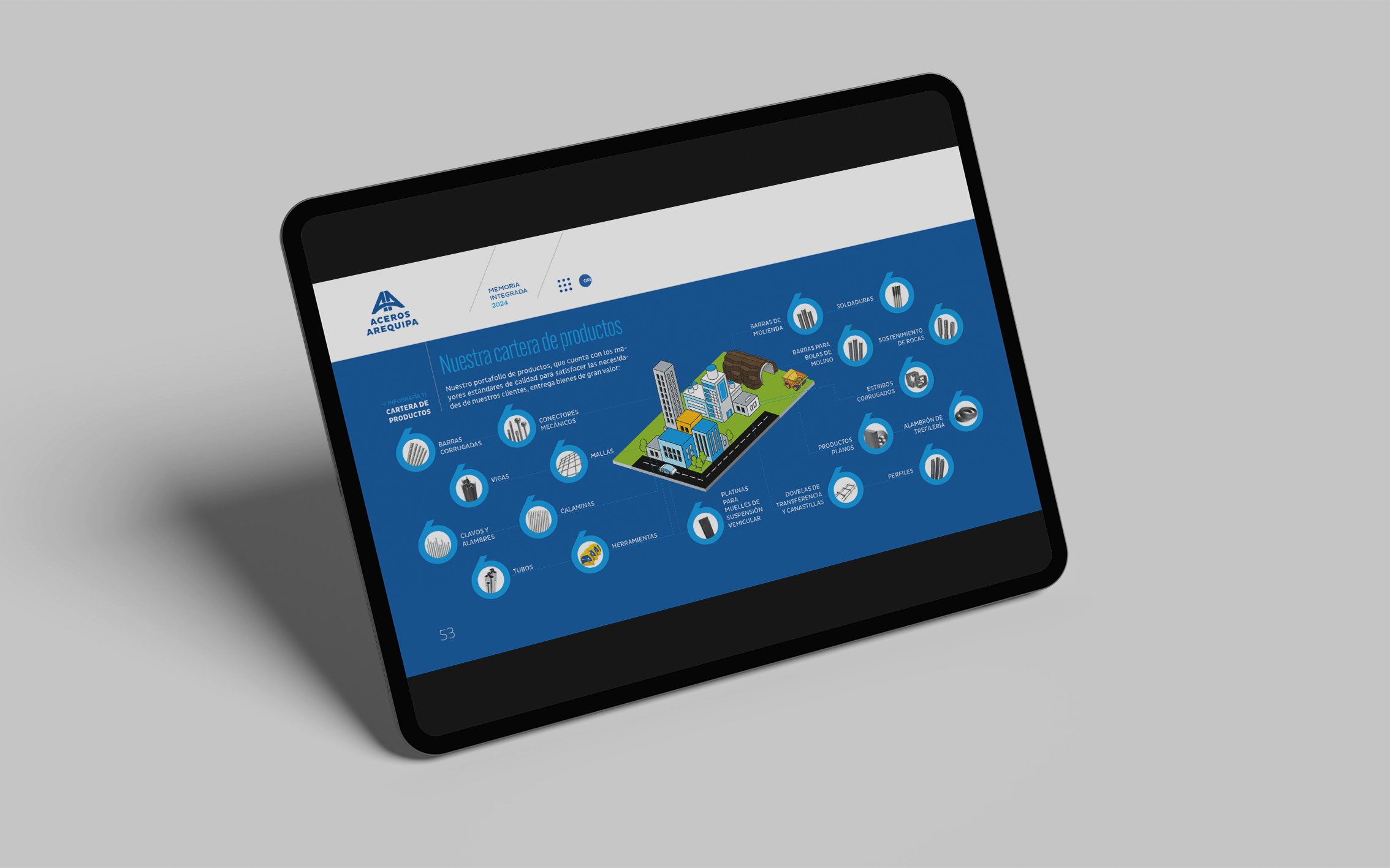 La memoria integrada 2024 de Aceros Arequipa celebró sus 60 años construyendo los cimientos del país —de carreteras y hospitales a hogares. Desde hace tres años confiaron en nosotros el diseño de sus reportes e informes internos. Para esta edición especial, trabajamos con su identidad corporativa priorizando legibilidad, orden y claridad como bases de comunicación.