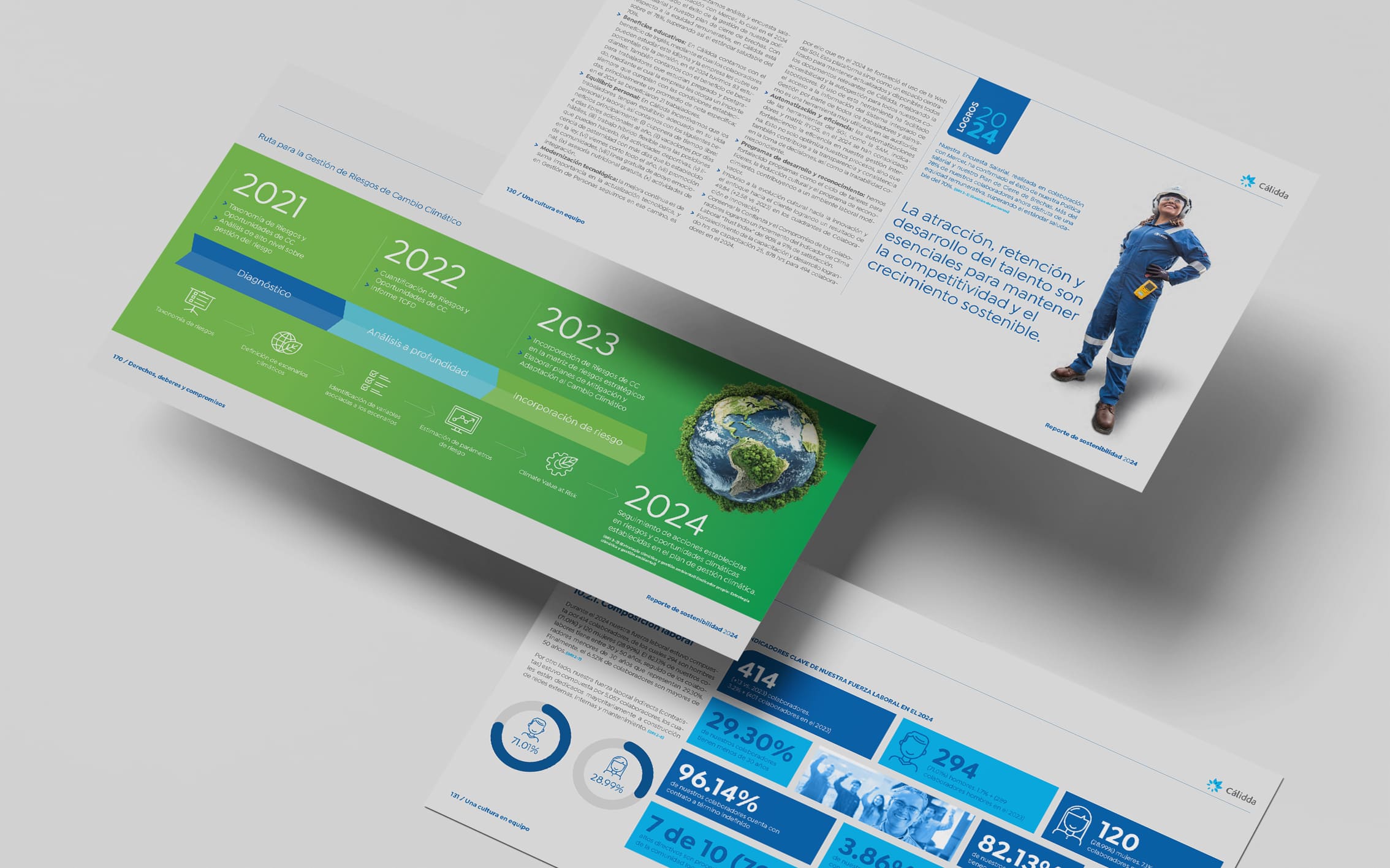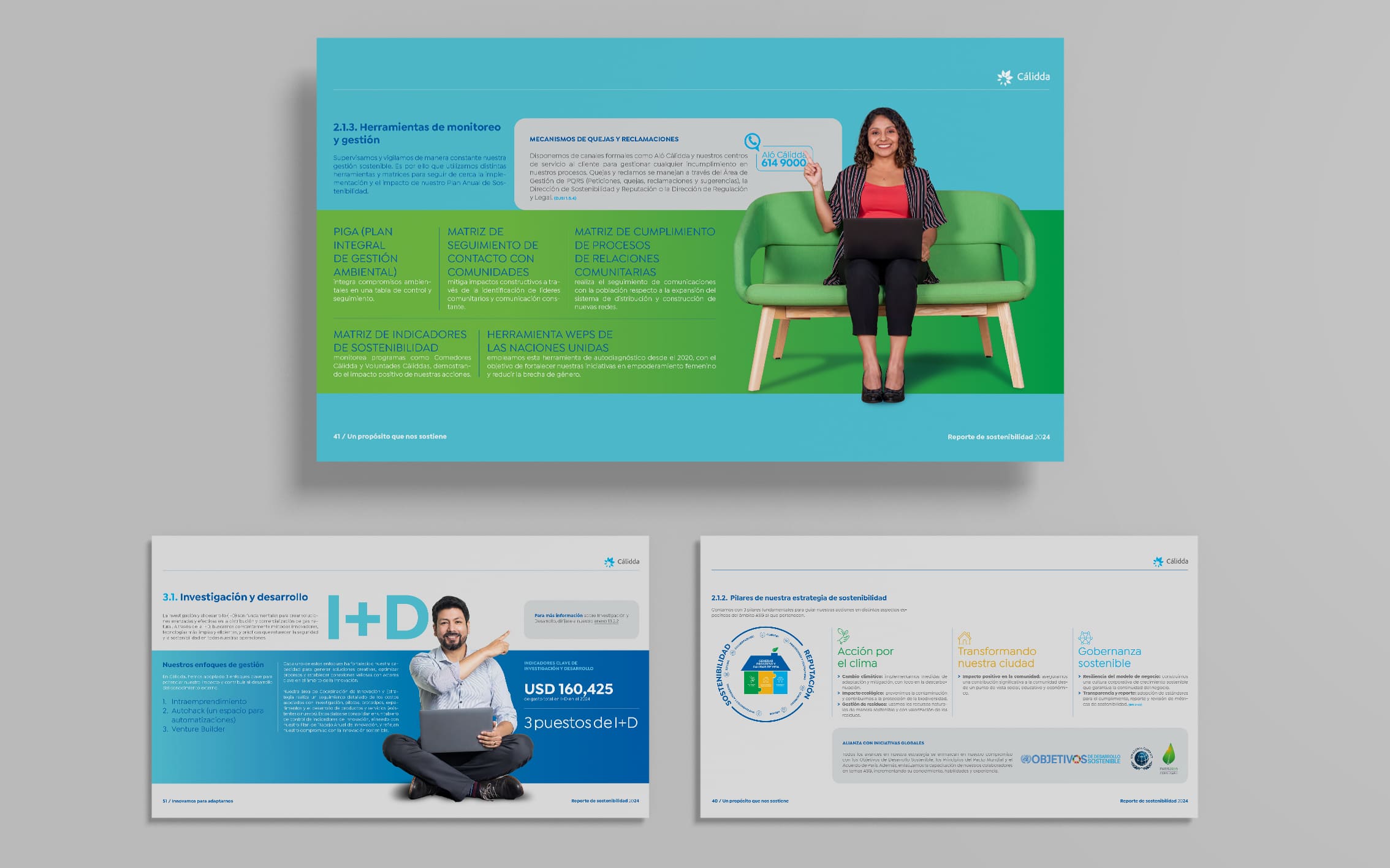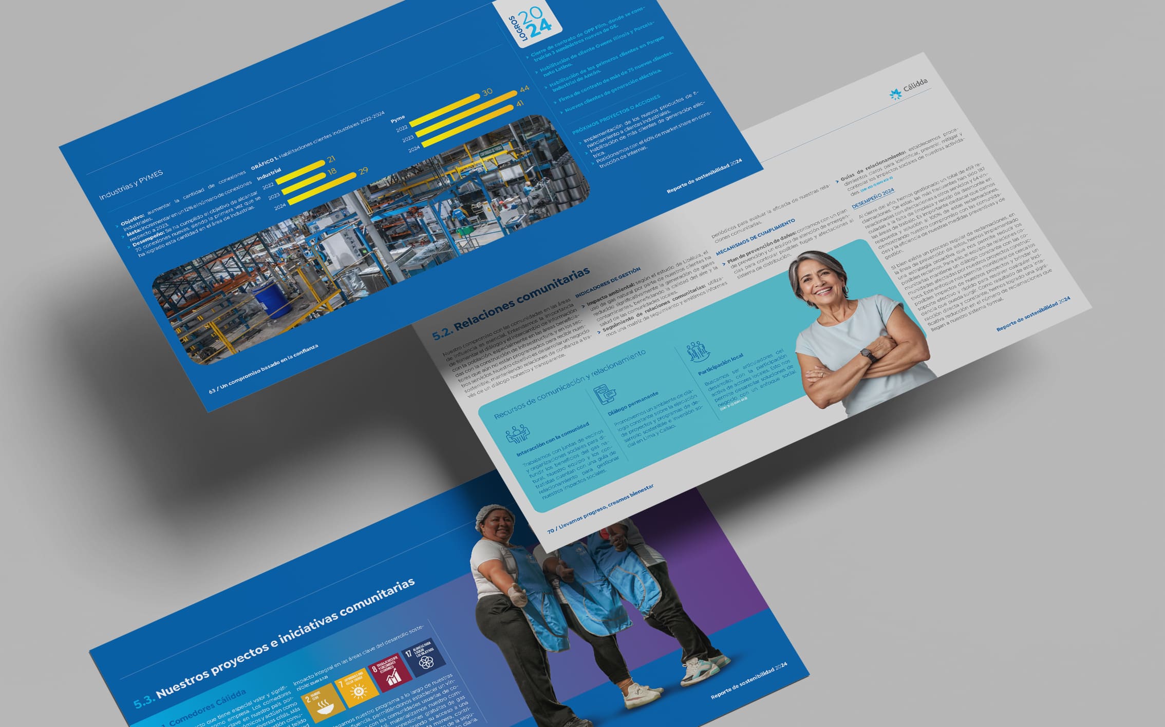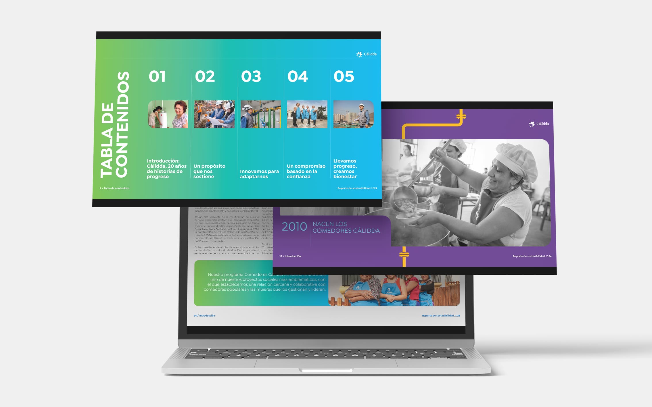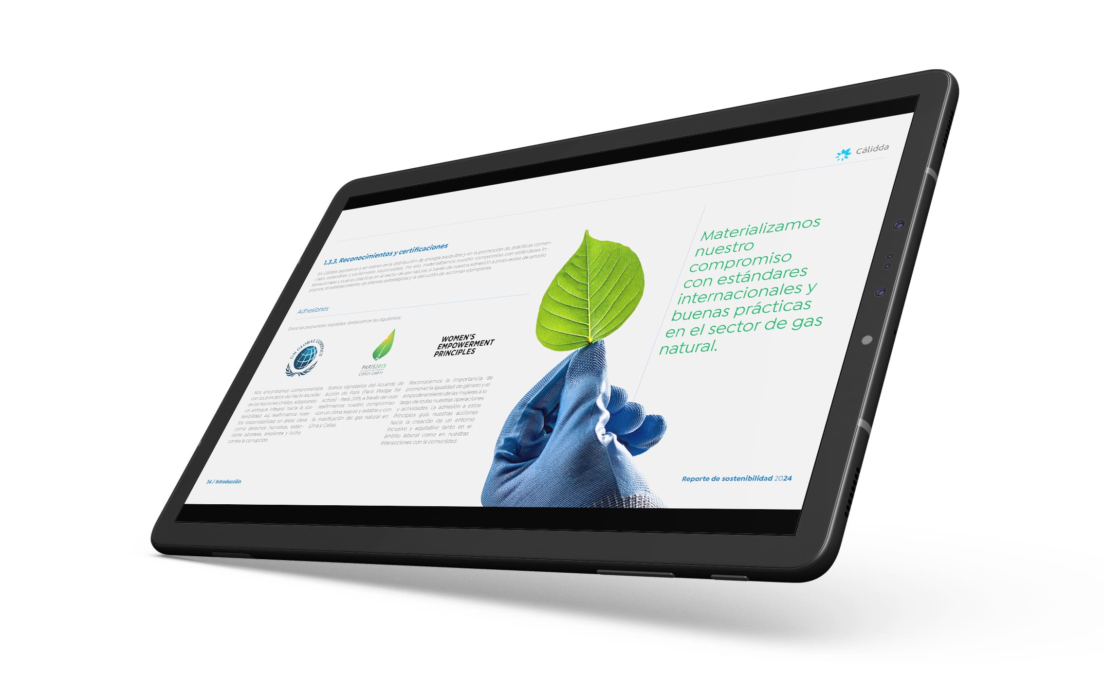 Cálidda distribuye gas natural en Lima y Callao, acercando una energía más segura, accesible y sostenible a millones de peruanos. Su informe de gestión —casi 300 páginas entre narrativa, tablas, gráficos y estándares GRI y SASB— exigía claridad total. Orden visual, fotografía precisa y jerarquización nos permitieron editar un documento coherente de principio a fin.