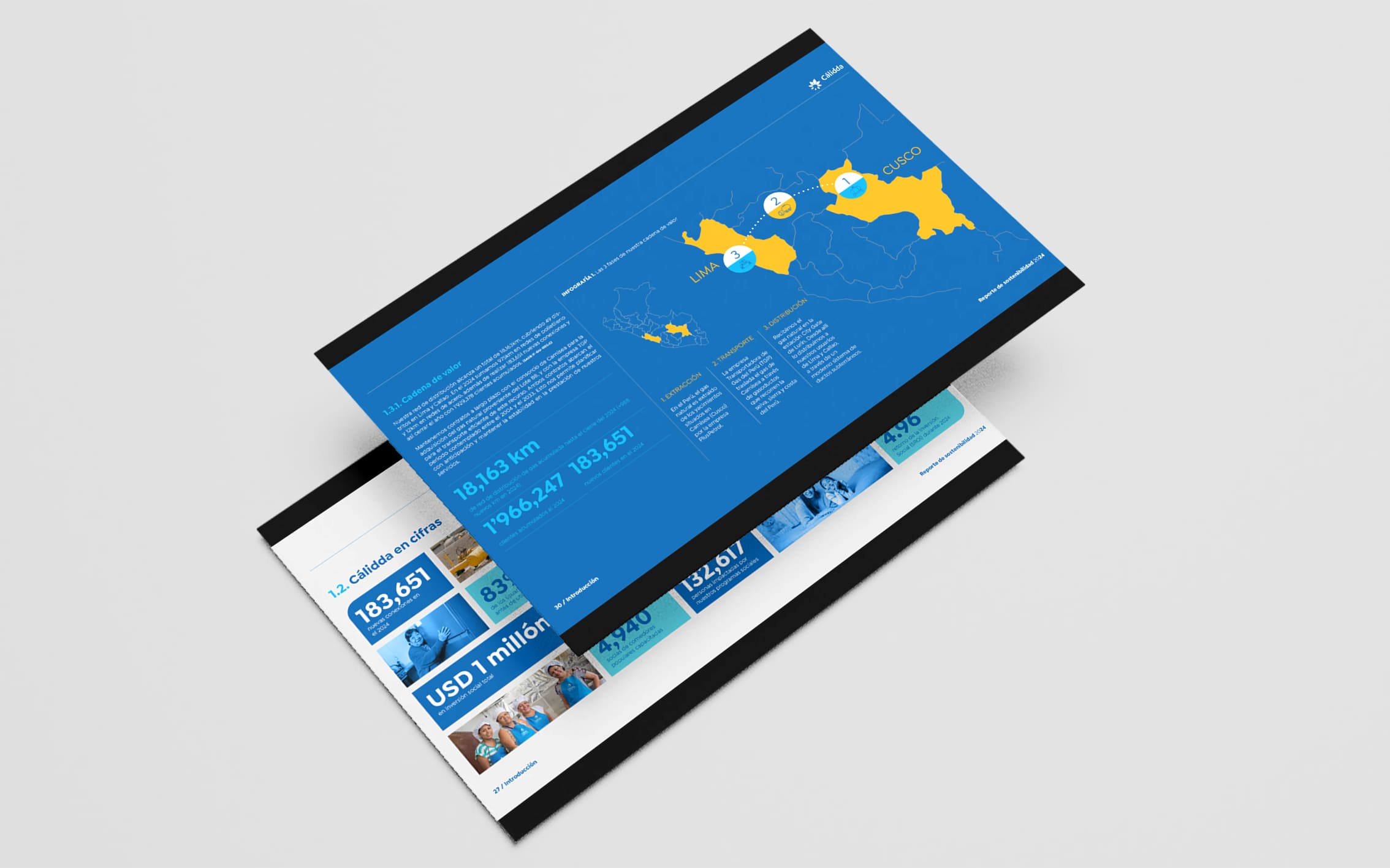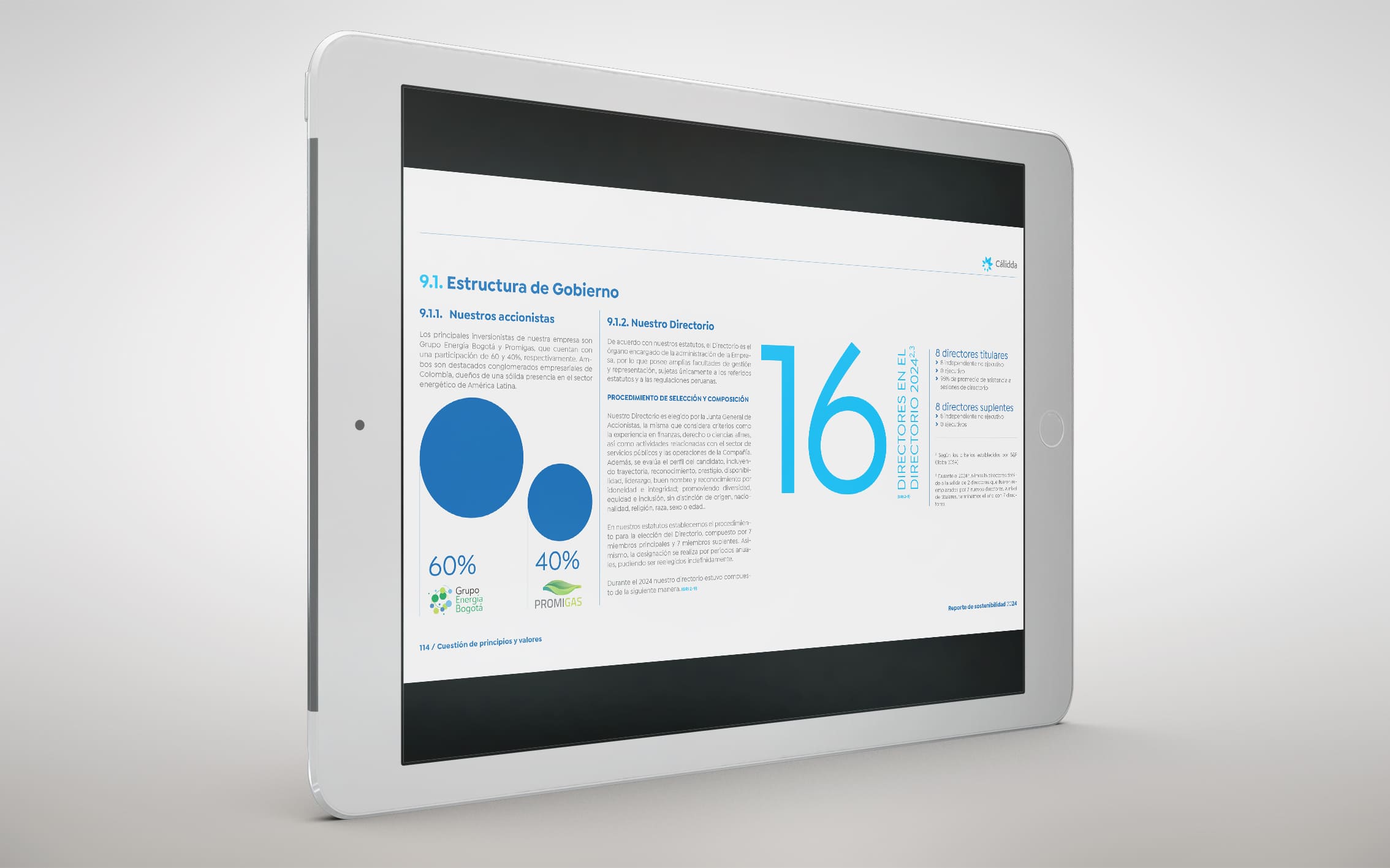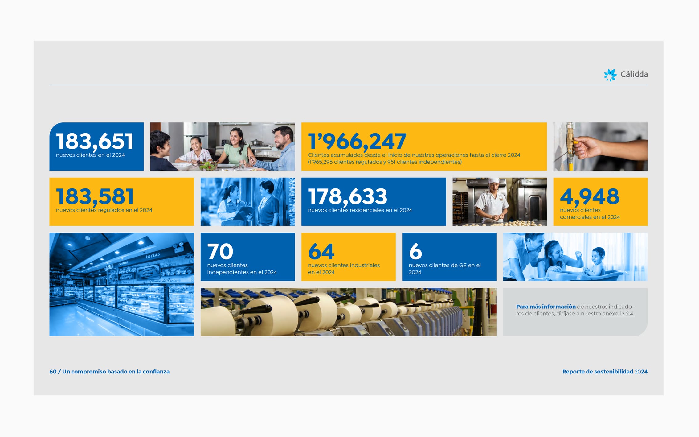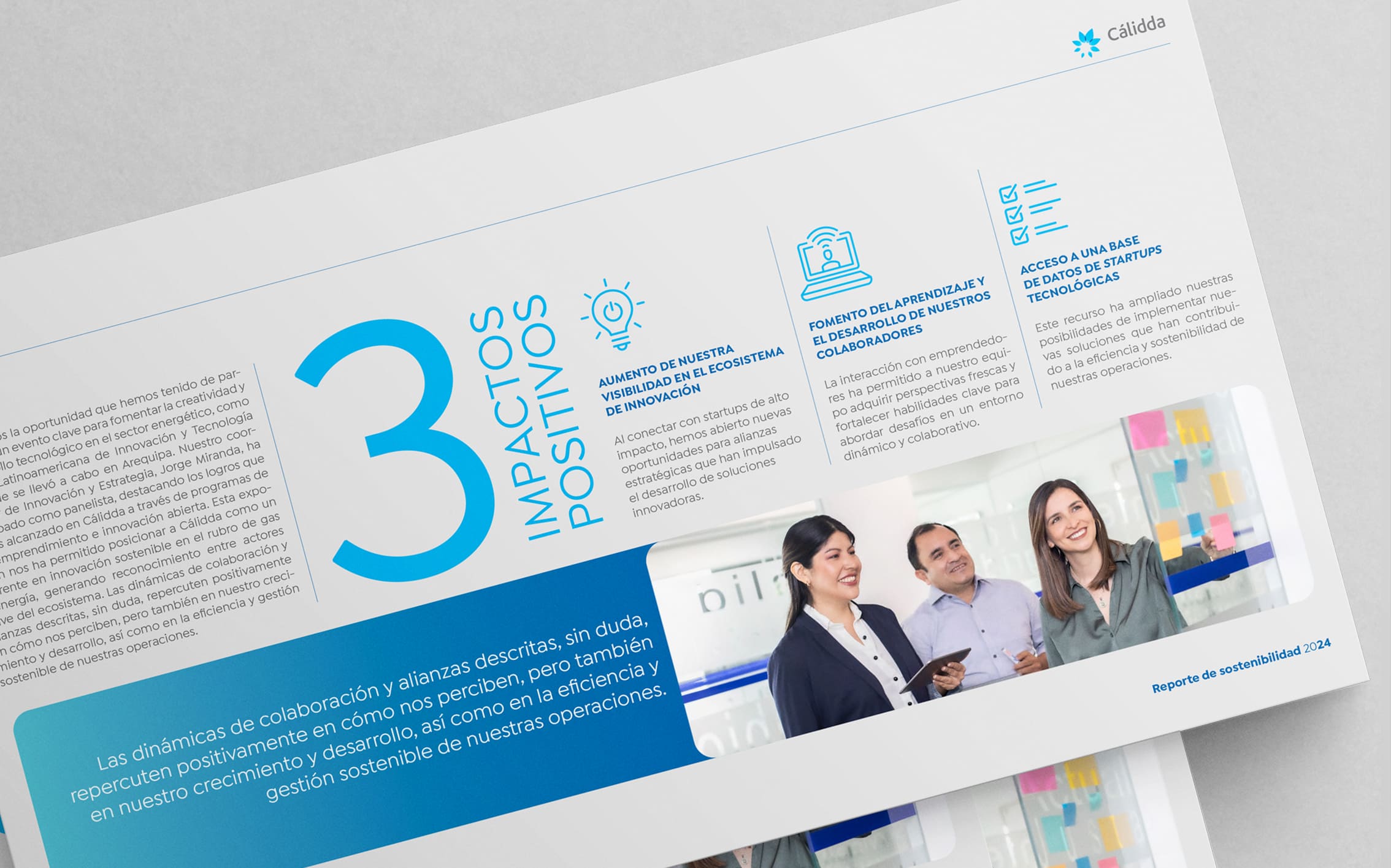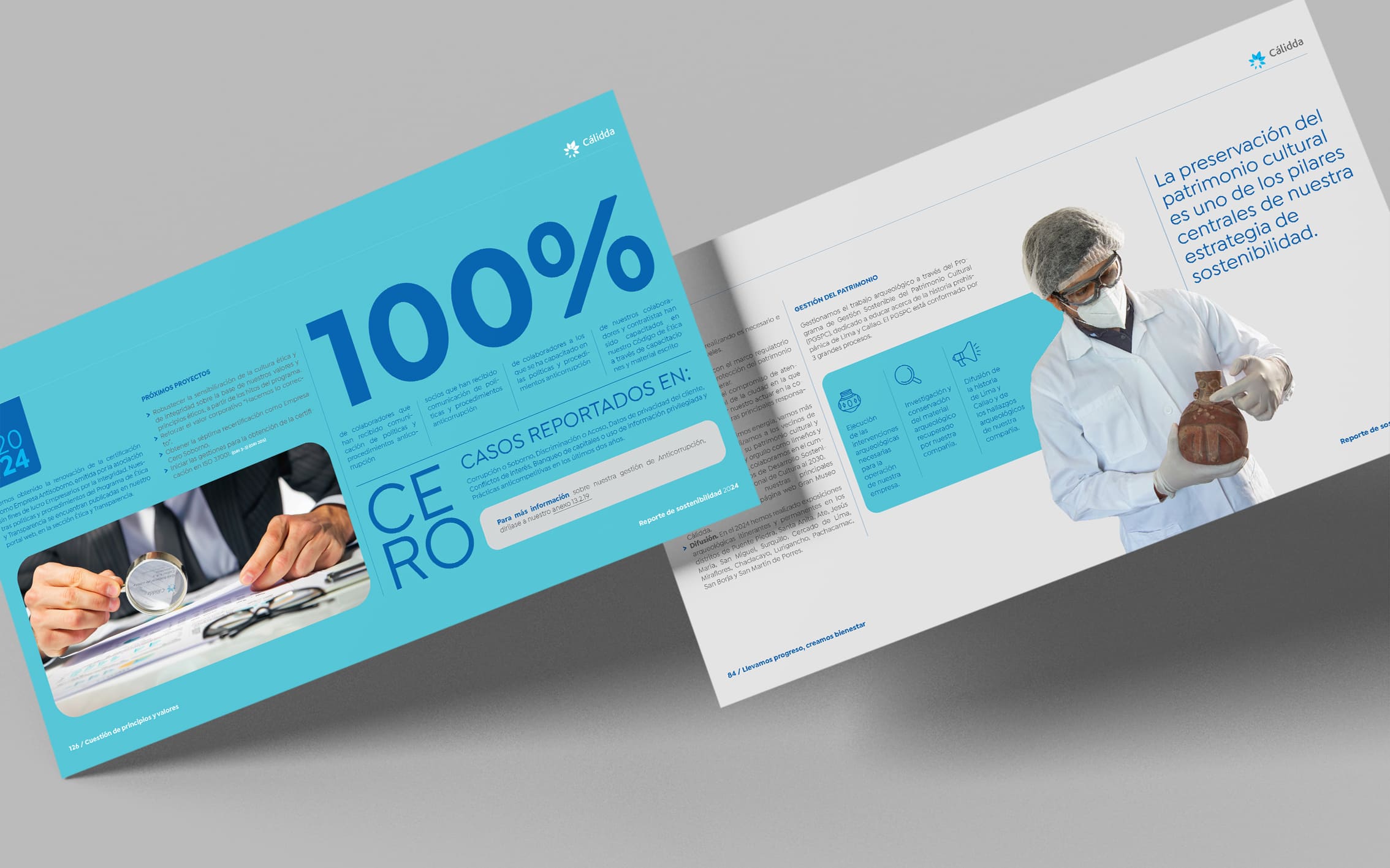 Cálidda distribuye gas natural en Lima y Callao, acercando una energía más segura, accesible y sostenible a millones de peruanos. Su informe de gestión —casi 300 páginas entre narrativa, tablas, gráficos y estándares GRI y SASB— exigía claridad total. Orden visual, fotografía precisa y jerarquización nos permitieron editar un documento coherente de principio a fin.