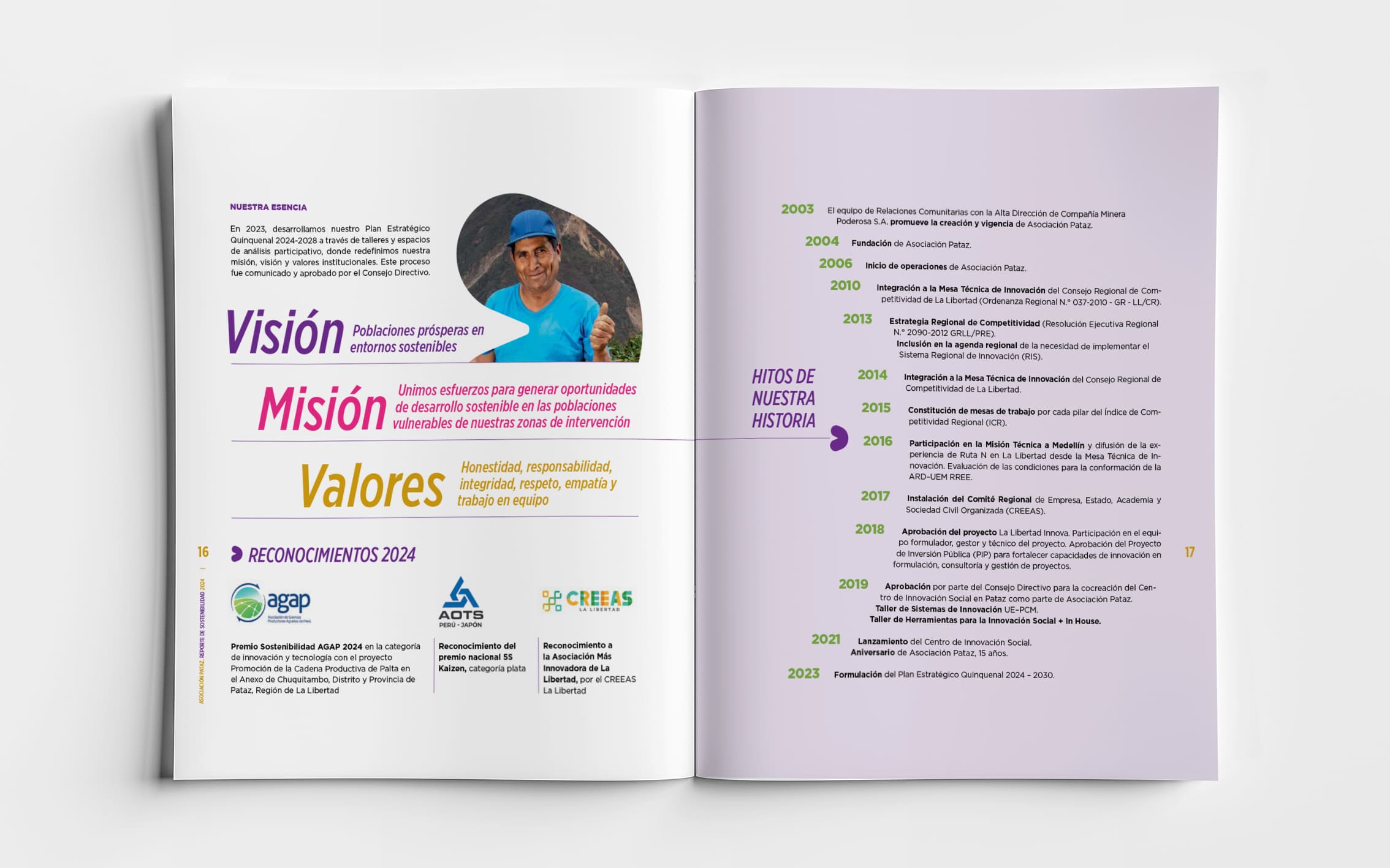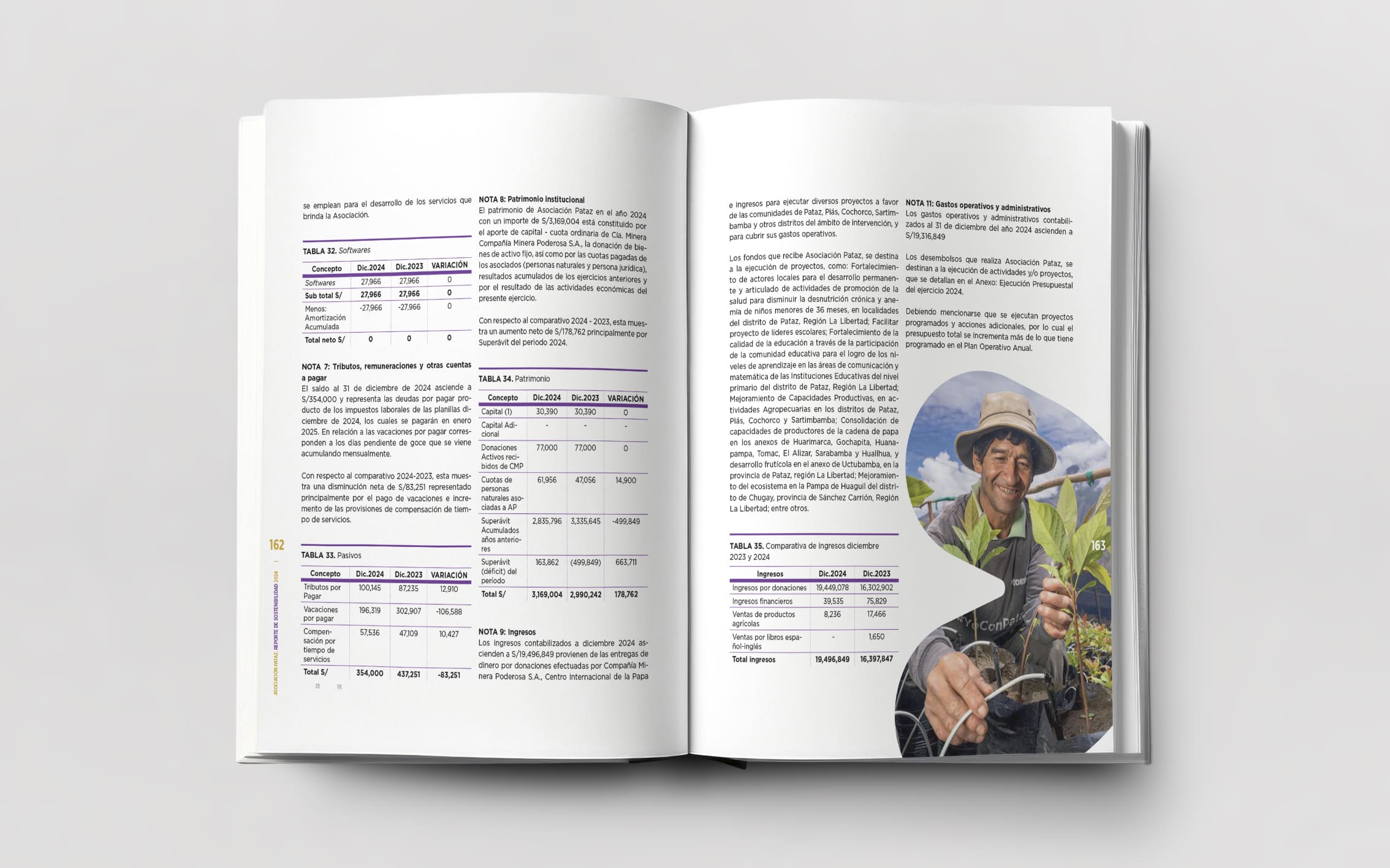 La Asociación Pataz impulsa el desarrollo social, económico y ambiental en las comunidades de la sierra liberteña, articulando proyectos que mejoran la calidad de vida de miles de familias. Al diseñar sus reportes, el reto es hacer legible una gran cantidad de datos sin perder el sentido del relato. Jerarquía, gráficos claros, contraste y orden visual se convierten en aliados del lector.