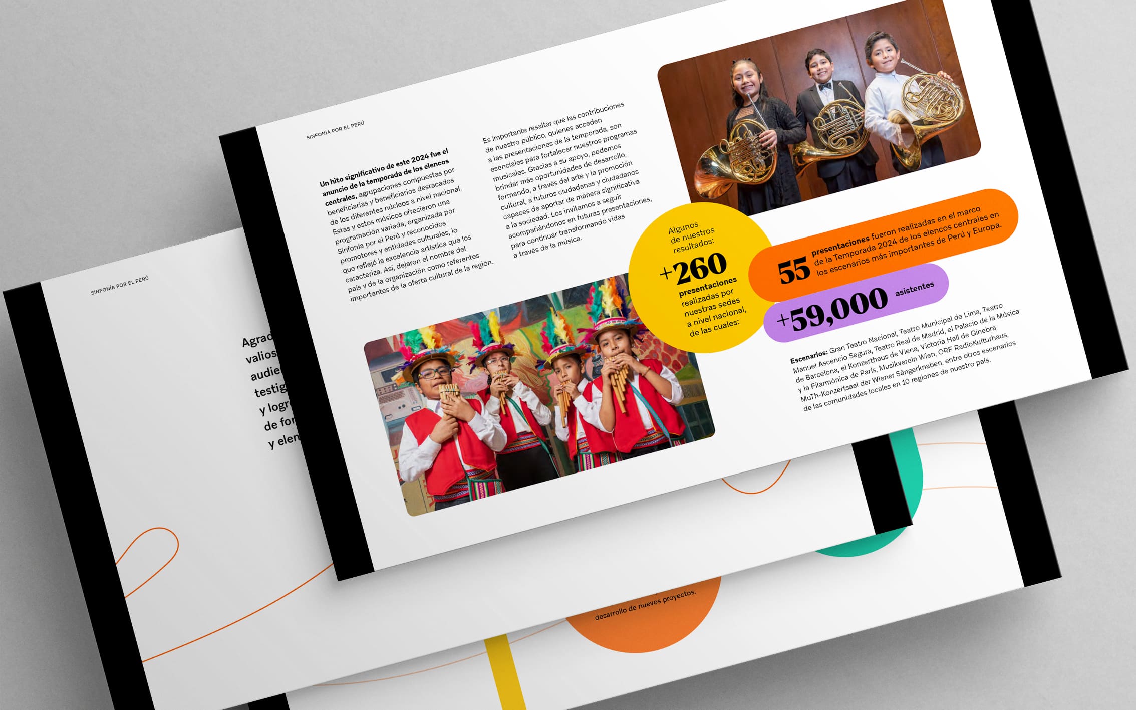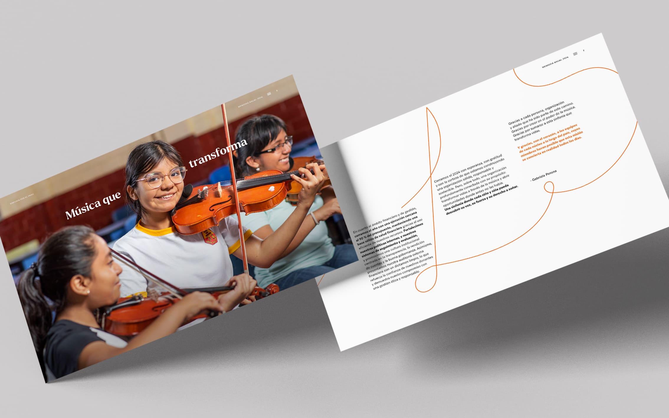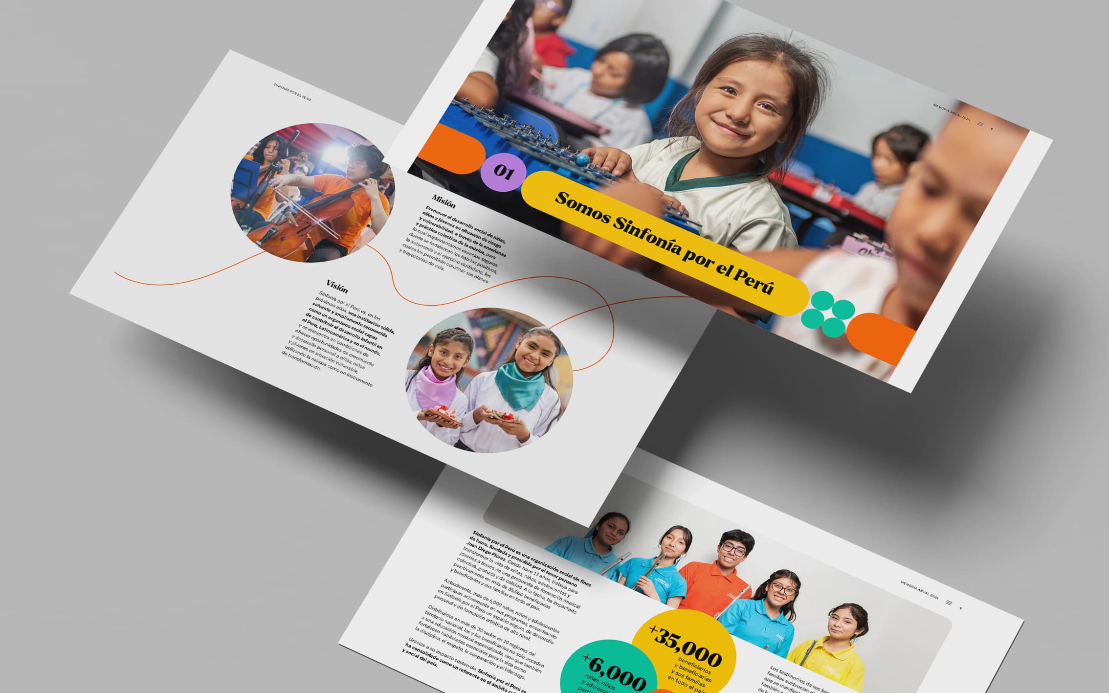 Sinfonía por el Perú, organización sin fines de lucro liderada por el tenor Juan Diego Flórez, transforma vidas a través de la enseñanza colectiva de la música. Diseñar su memoria anual fue como componer una sinfonía con un estilo minimalista donde la melodía —el contenido— guía al lector, mientras que los arreglos visuales sorprenden sin romper el tono. A ratos adagio, a ratos presto, siempre en armonía.