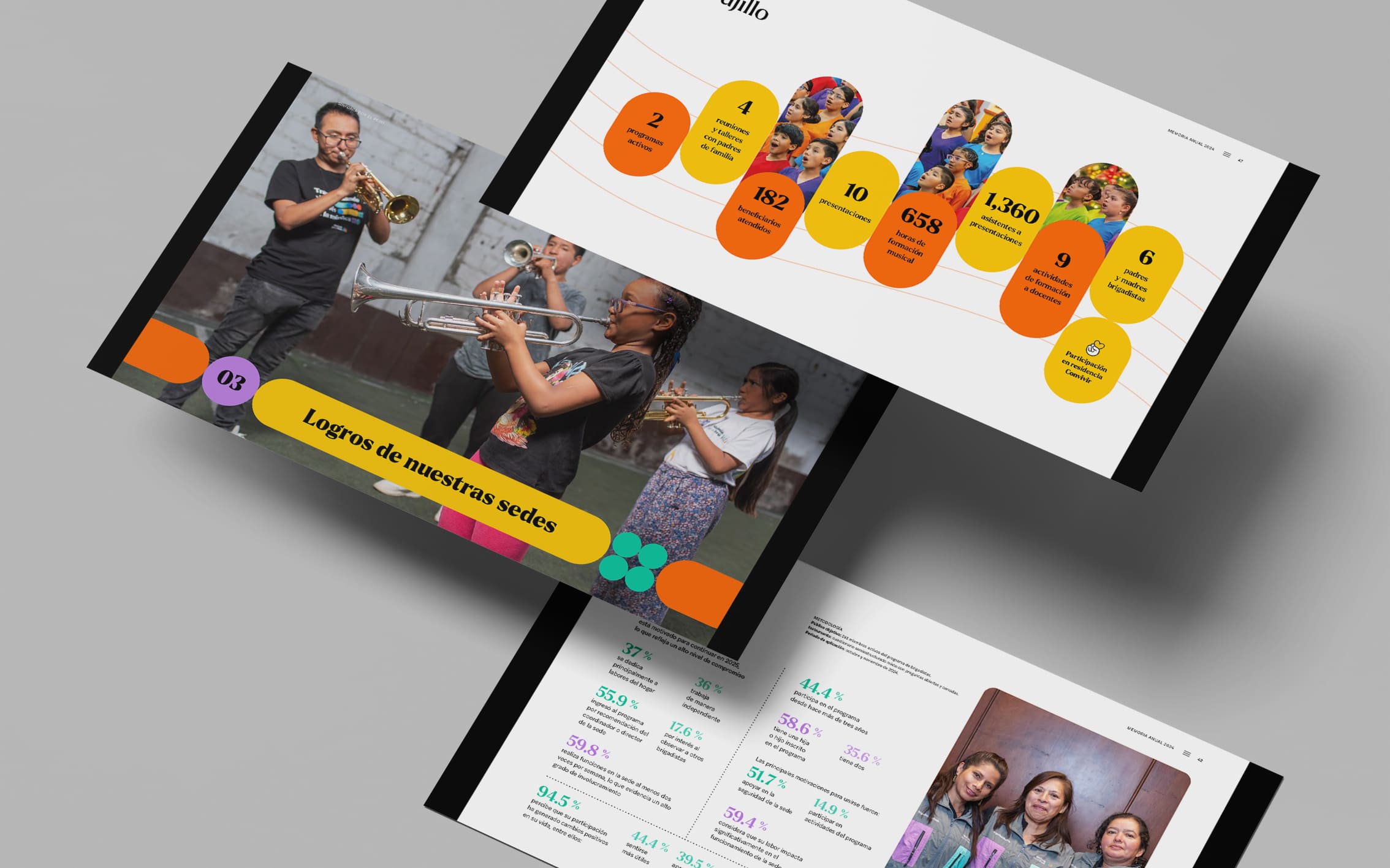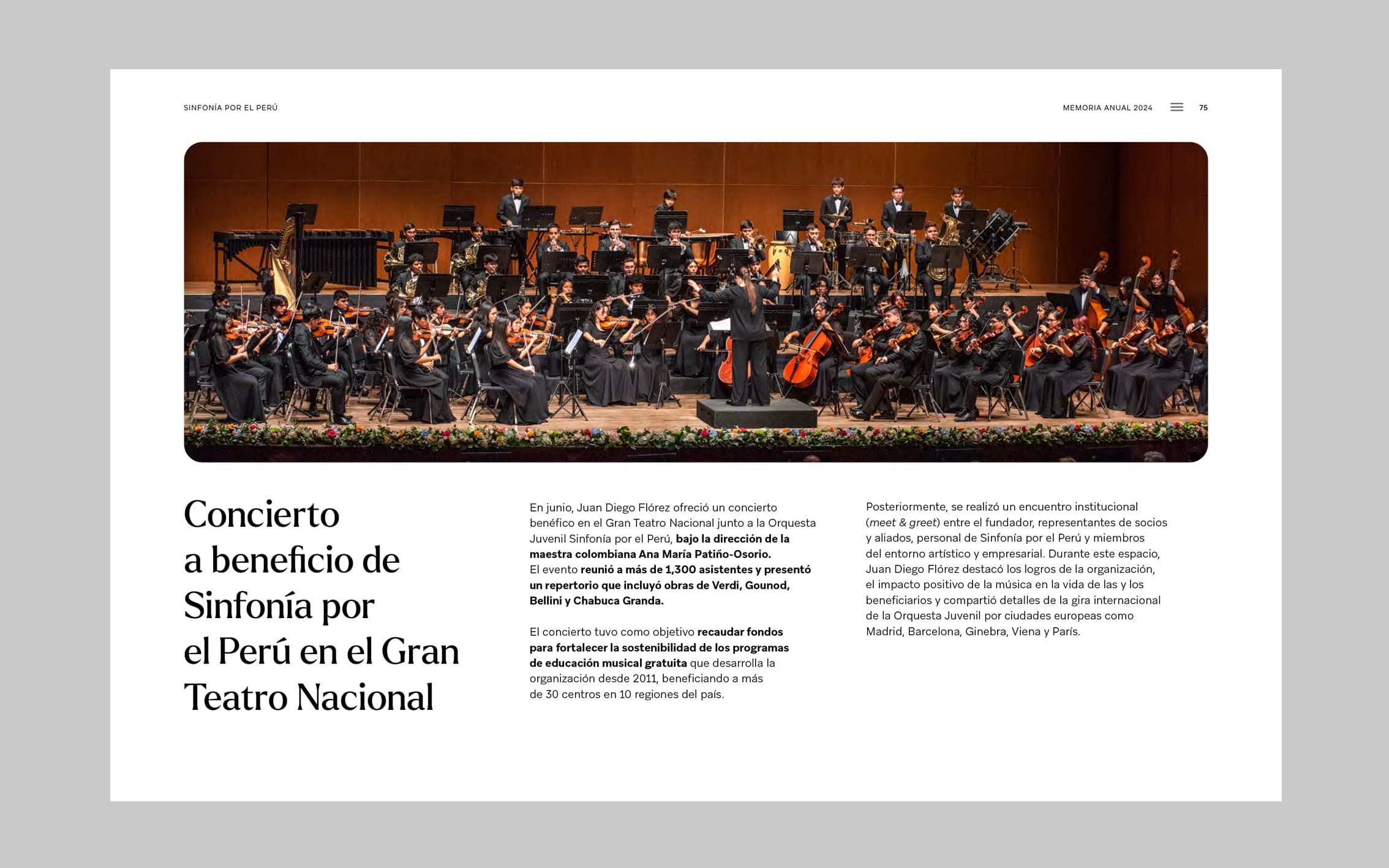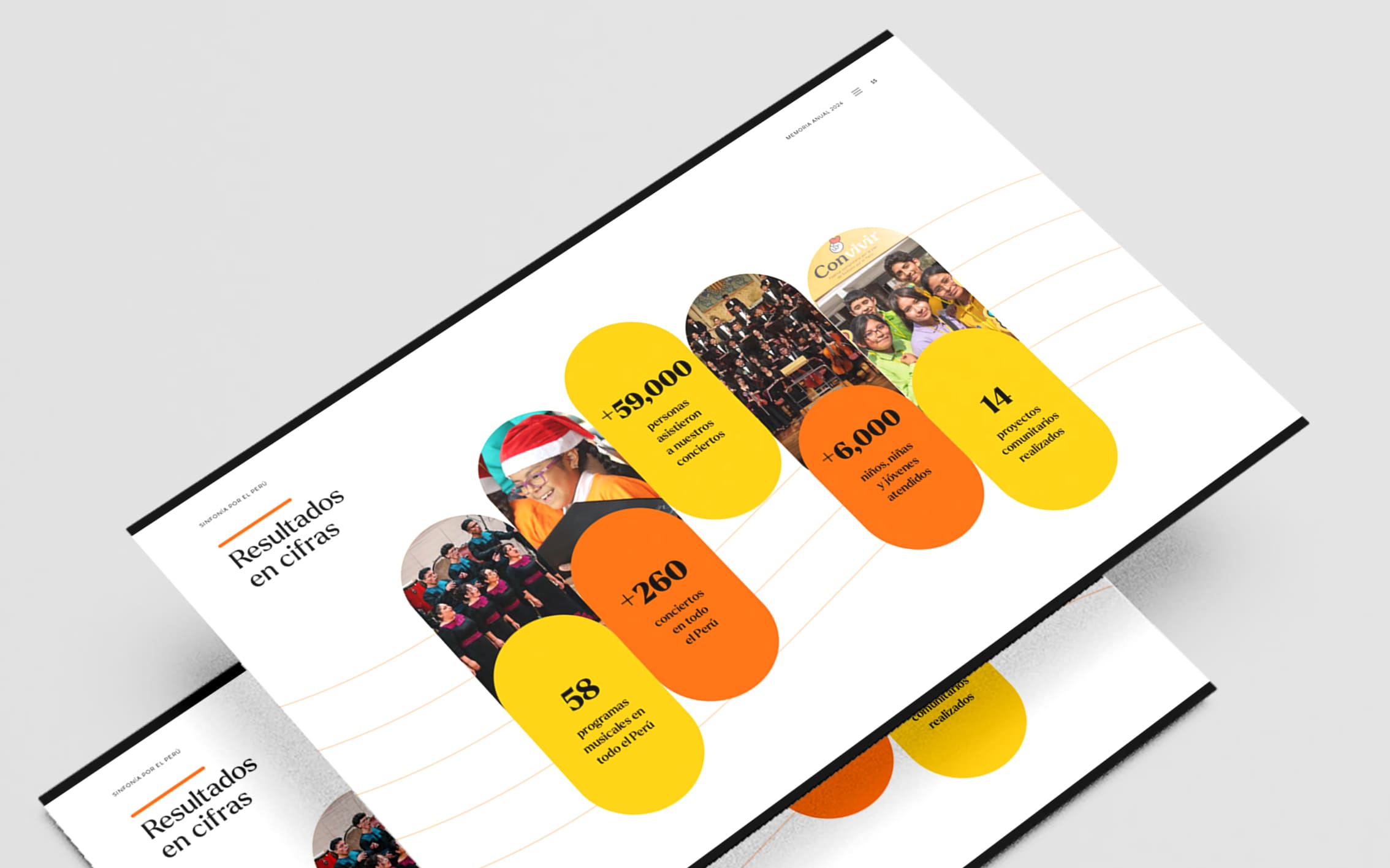 Sinfonía por el Perú, organización sin fines de lucro liderada por el tenor Juan Diego Flórez, transforma vidas a través de la enseñanza colectiva de la música. Diseñar su memoria anual fue como componer una sinfonía con un estilo minimalista donde la melodía —el contenido— guía al lector, mientras que los arreglos visuales sorprenden sin romper el tono. A ratos adagio, a ratos presto, siempre en armonía.